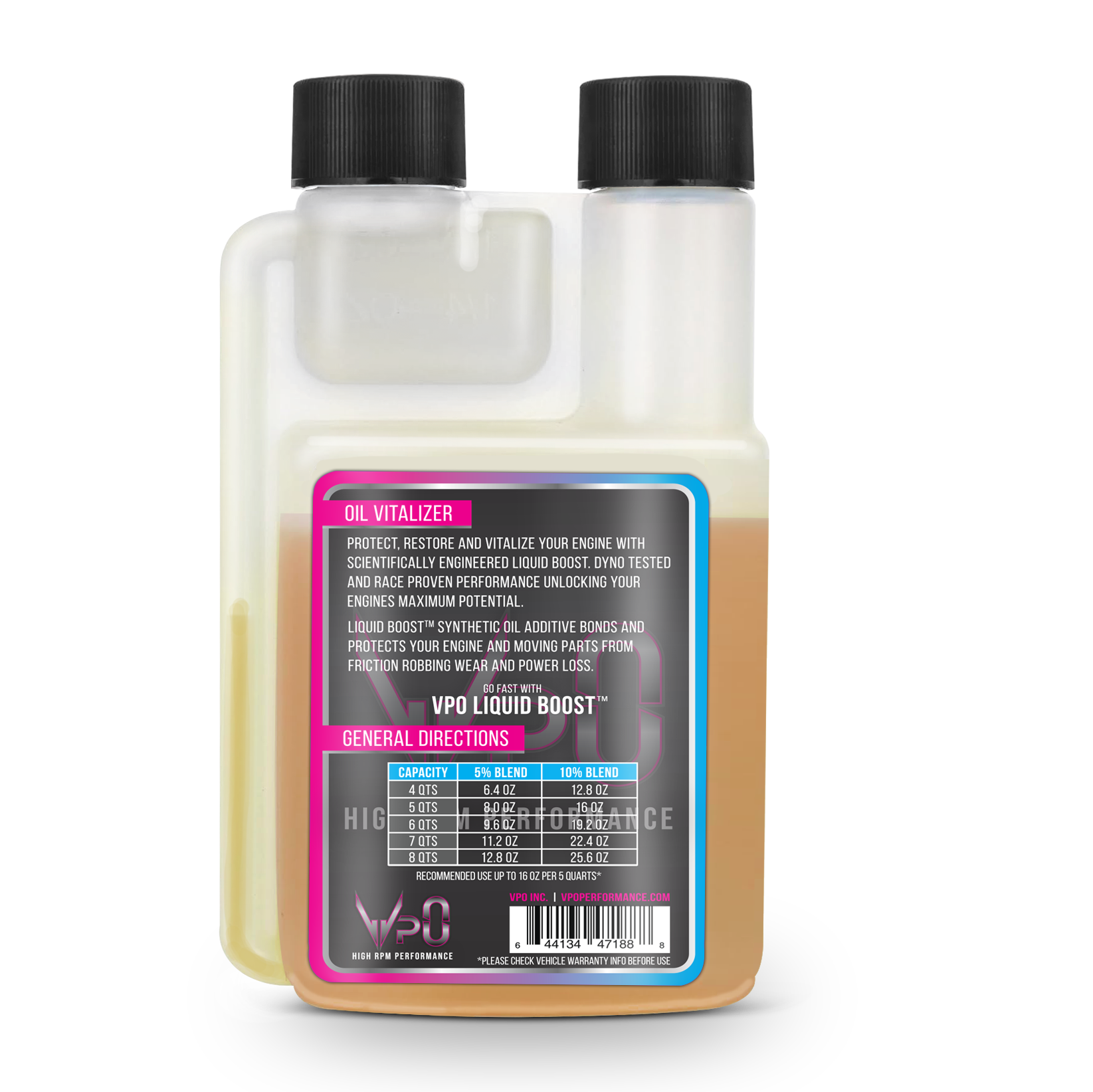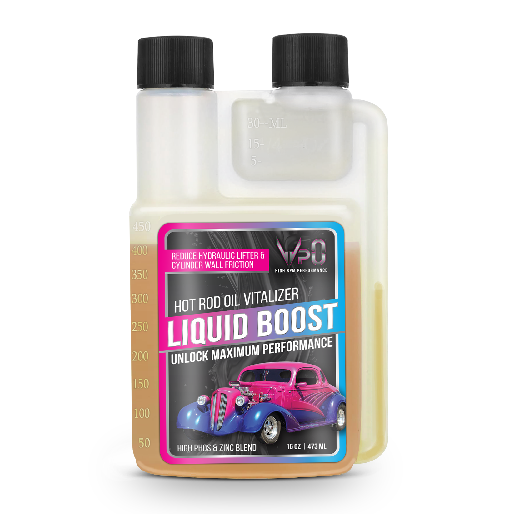 VPO Liquid Boost - HOT ROD Oil Vitalizer is a high-performance, synthetic oil treatment engineered to optimize and prolong the efficiency of modern & classic engines that require heavier weight oils across diverse operating conditions. Utilizing a proprietary friction-modifying additive system—proven in both road and track applications—this advanced formulation enhances horsepower, reduces operating temperatures, and improves fuel economy.